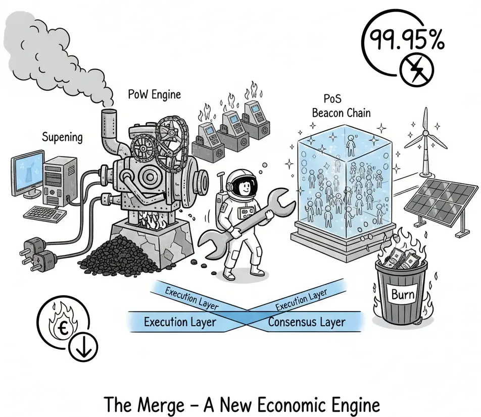 以太坊之前是一台依靠燃烧大量汽油来运转的巨大引擎(工作量证明,PoW),噪音大、能耗高。而“合并”就像是在汽车行驶过程中,不停车、不熄火,直接将汽油引擎换成了一台高效、安静的电动机(权益证明,PoS)。