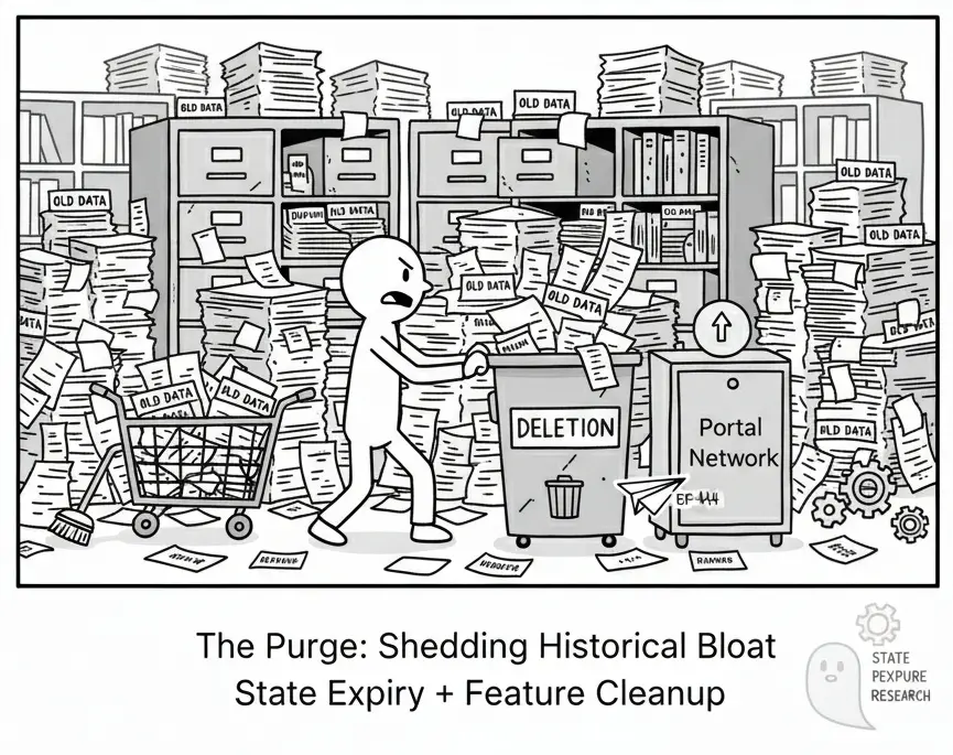“清除”阶段的目标是为以太坊进行一次“大扫除”,清理掉常年累积的历史数据和技术债务。目前,节点默认需要存储自 2015 年以来的所有历史区块,这不仅占用大量硬盘空间,也让新节点加入网络变得非常耗时。