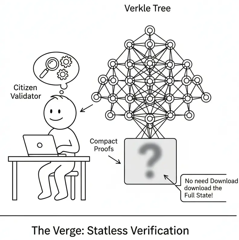一个“无状态客户端”就像一个图书管理员,他不需要把整座图书馆的书都记在脑子里。当有人来问某本书是否存在时,提问者会同时提供这本书和一张“索引卡”(Verkle 证明)。管理员只需核对这张卡片,就能立刻验证这本书确实属于这座图书馆,而无需亲自去书架上查找。