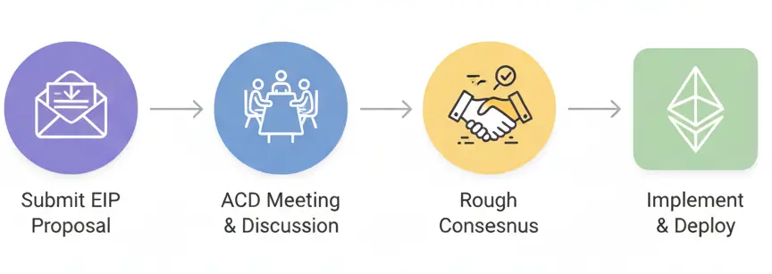 以太坊的治理不像是一家公司由CEO拍板,更像是一个开放的城市规划委员会。任何人都可以提交“城市建设计划书”(即 EIPs ,以太坊改进提案)。