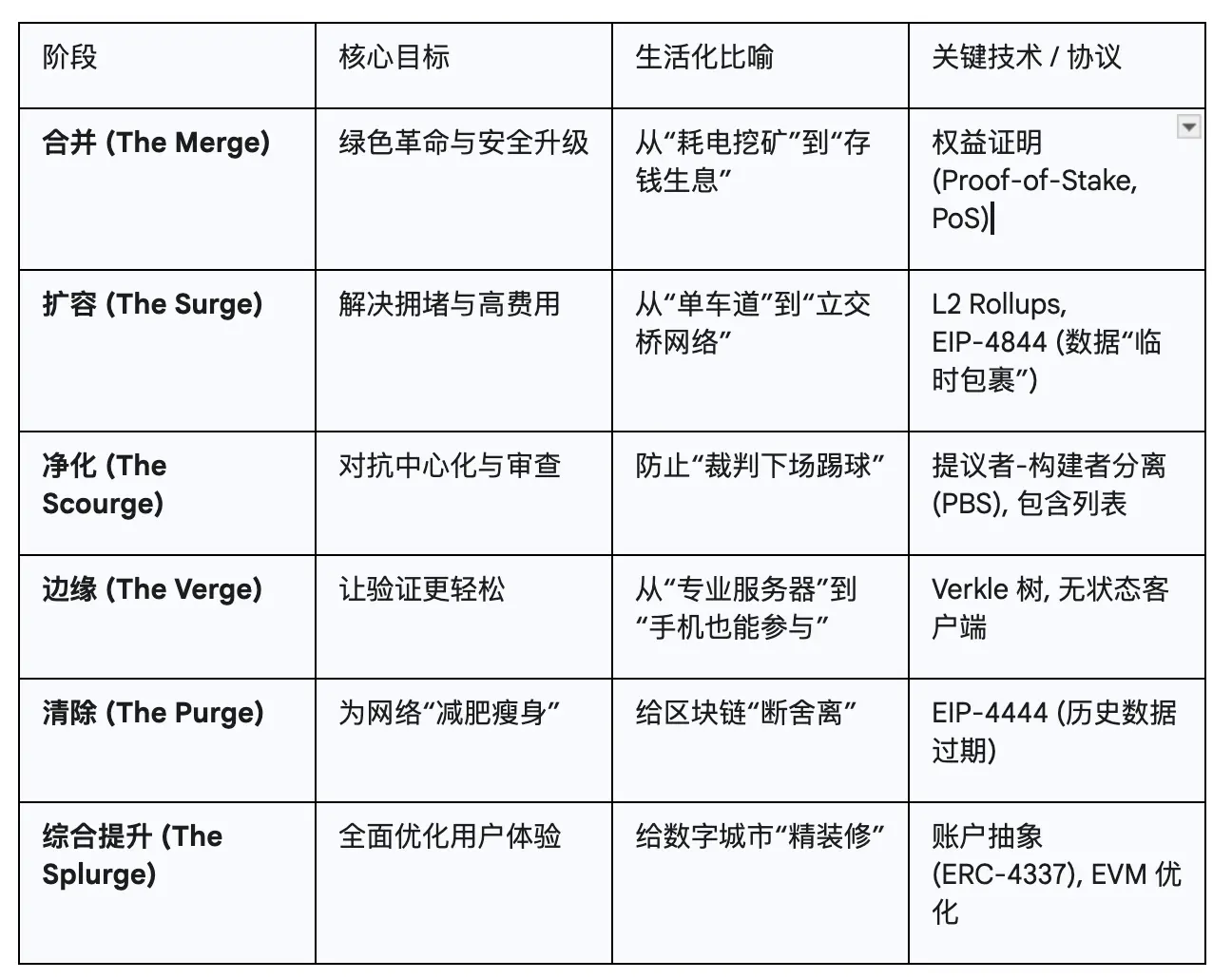 本报告旨在用最通俗的语言和生活化的比喻,为你全面解读以太坊宏大的技术升级路线图。这份路线图不仅是一系列技术更新,更是以太坊从“世界计算机”的最初构想,演变为一个安全、可扩展、去中心化的“全球数字账本”的战略蓝图。我们将逐一剖析路线图的六大核心阶段——合并(The Merge)、扩容(The Surge)、净化(The Scourge)、边缘(The Verge)、清除(The Purge)和综合提升(The Splurge)。
