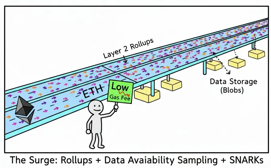 “扩容”阶段的目标非常明确:将以太坊生态的处理能力从目前的几十 TPS 提升至每秒超过 10 万笔交易(100,000+ TPS)。这并非要拓宽 L1 主路本身,而是要为 L2 “立交桥”们提供海量、廉价的“建筑材料”(数据空间)。