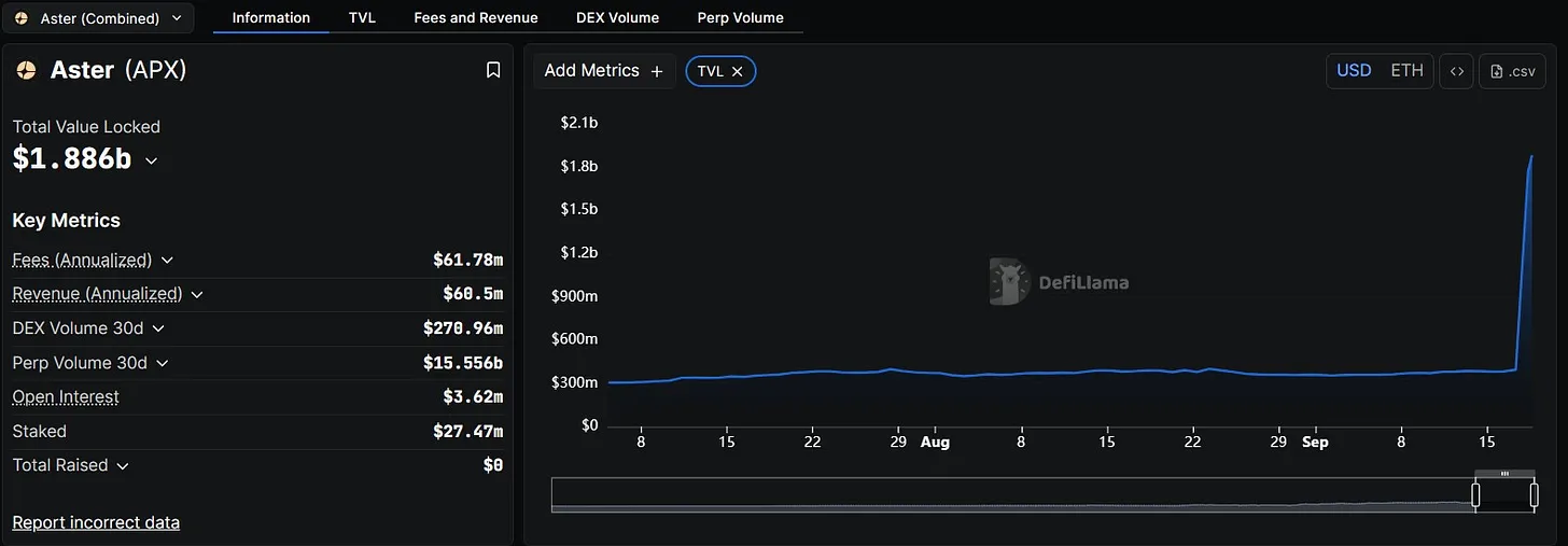 该平台是多链去中心化交易所,支持 BNB 链、以太坊、 Solana 和 Arbitrum 网络,通过聚合多链流动性实现无需手动跨链的无缝交易。自 2025 年 3 月上线以来, ASTER 已为 200 万用户处理逾 5140 亿美元交易量。代币发行后,平台总锁仓价值曾短暂触及 20 亿美元峰值,截至 2025 年 9 月已回落至 6.55 亿美元。