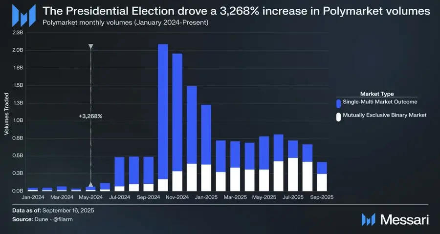 2024 年选举使得 Polymarket 的交易量从 5 月的 6200 万美元飙升至 10 月的 21 亿美元,增长了 3268%。