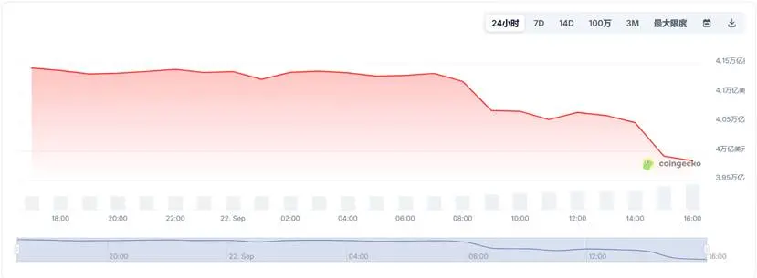 据 CoinGecko 数据,截至 9 月 22 日 18:00 ,全球加密货币市值为 3.97 万亿美元,过去 24 小时内变化率为 -3.98% 。也就是说,加密货币总市值蒸发了将近 1600 亿美元。