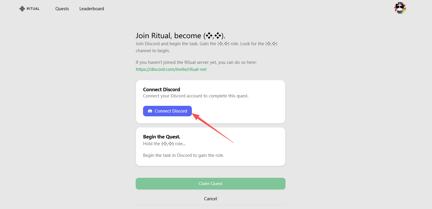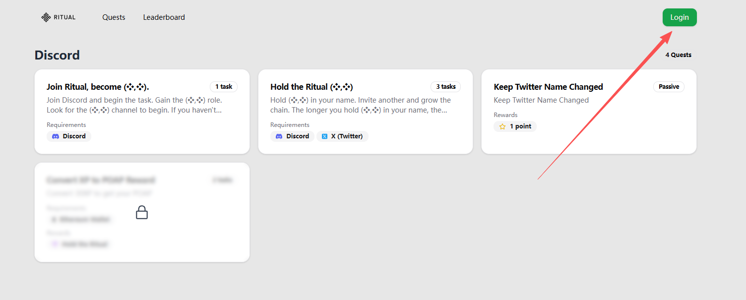 STEP 1. 进入交互网站(链接: https://ritual-synful.domino.page/quests ),点击右上方的 Login,通过 X 账号进行登录。