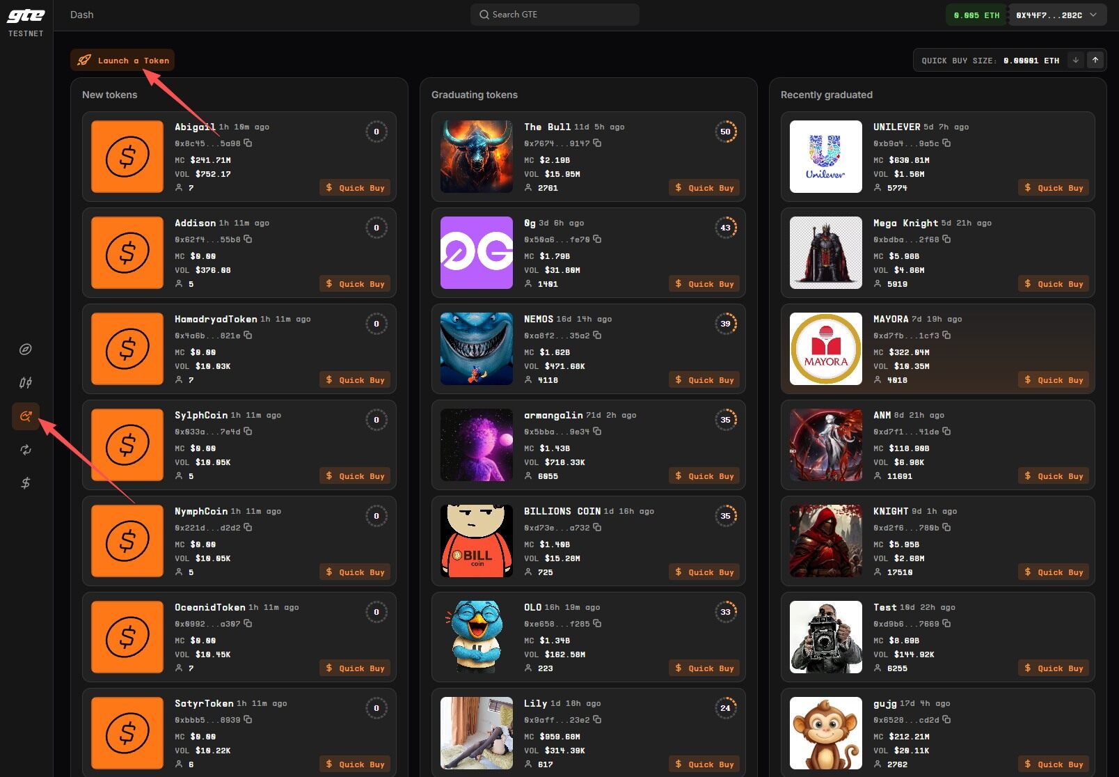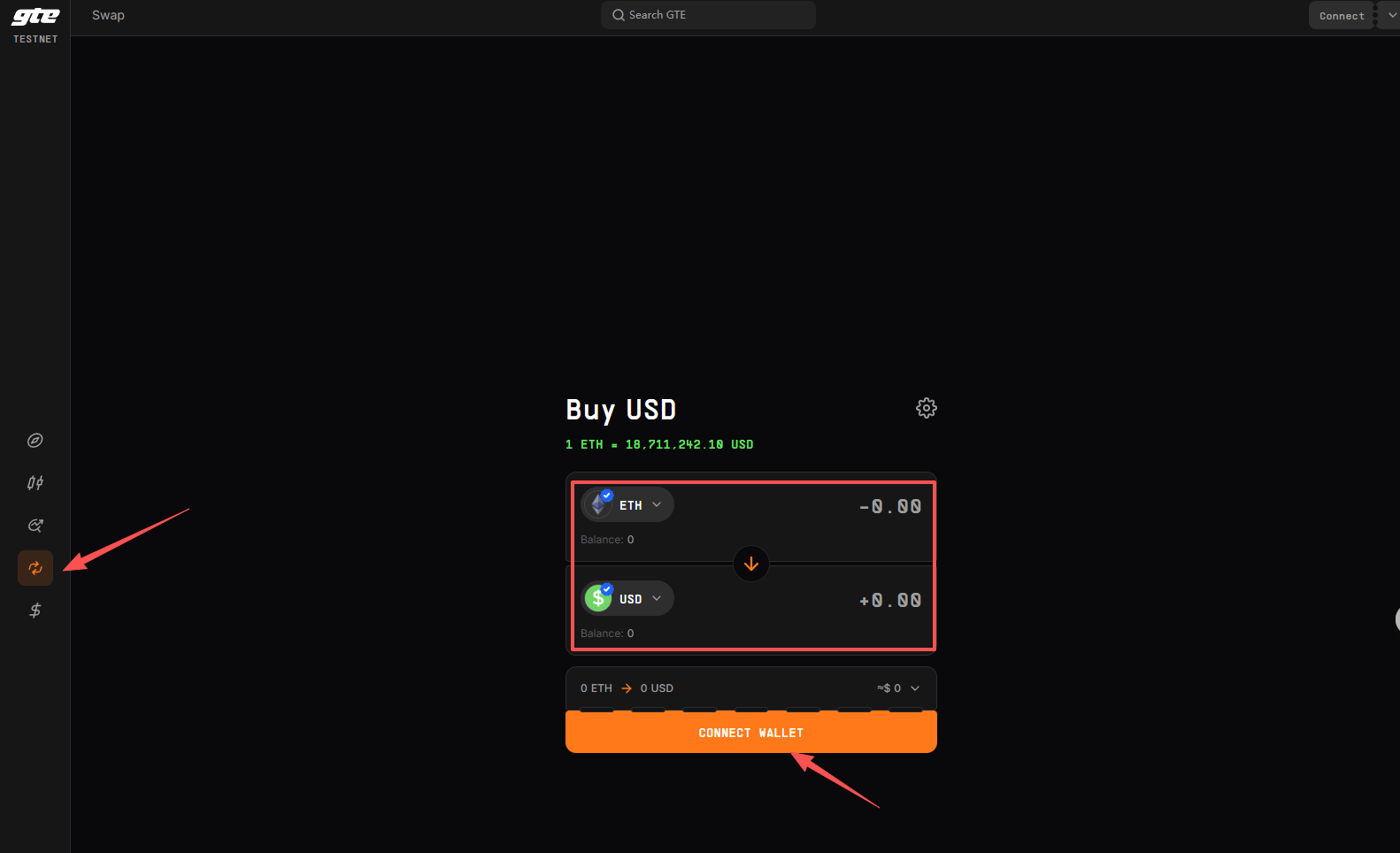 STEP 2. 进入 GTE 网站(链接: https://testnet.gte.xyz/swap ),将 ETH 兑换成其他代币。