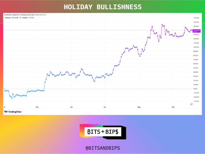 此外,尽管 ETH 今年已实现大幅涨价(年初至今涨幅 36.6%,自 4 月 1 日以来涨幅更是高达 140.59%),但考虑到第四季度是加密货币行业「历史上的看涨周期」,预计 ETH 在今年第四季度仍可能出现新一轮价格上涨。
