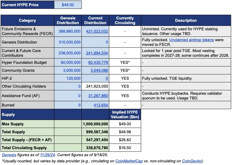 要理解这个提案,先得看清 HYPE 当前的供应结构。根据 Jon 提供的数据表,在 49 美元(他们提案时的 HYPE 价格)的价格下,HYPE 总共 10 亿枚的盘子里,实际流通的只有 3.37 亿枚,对应 165 亿美元市值。
