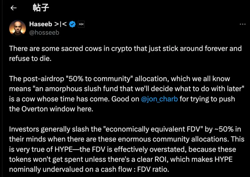 不是因为 HYPE 不好,而是因为账面数字太虚。Haseeb 认为,Jon 的提案是有推动作用的,把原本不能公开讨论的激进想法逐步变成可以接受的主流观点;我们需要质疑把代币分配给「社区储备」这个加密行业的惯例。