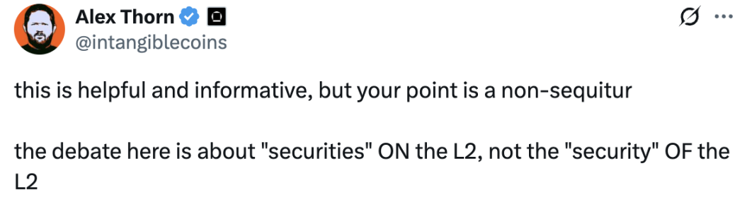 Galaxy 研究主管 Alex Thorn 认为 Vitalik 的观点并没有切中要点,其 表示 ,讨论的重点应是 L 2 上的证券(securities),而不是 L 2 的安全性(security)。虽然 Alex Thorn 没有明示,但其观点却指向了一个非常致命的问题:L 2 本身并非交易所,但如果 L 2 上的交易平台是建立在一个非常中心化的链上,那么这些交易平台是否还能被称为 DEX 以及是否应该受到监管?