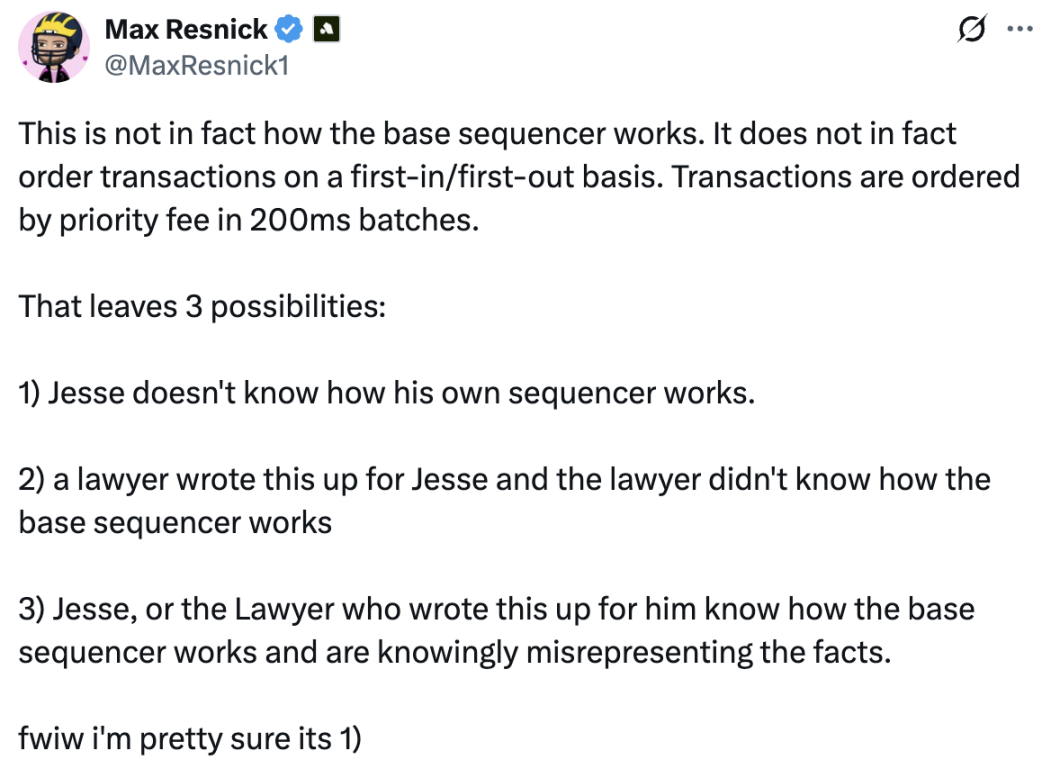 专注于 Solana 的研发公司 Anza 的首席经济学家 Max Resnick 就针对 Jesse Pollak 的说法提出了 质疑 ,Max Resnick 表示 Base 的排序器是以 200 毫秒为单位以优先级费用对交易进行排序,并非是遵循先进先出原则。虽然之后 Jesse Pollak 对此进行了解释,但很明显 Max Resnick 想要表达的关键点就是排序器是可以按照某些规则对交易重新排序的,直指排序器中心化的问题。