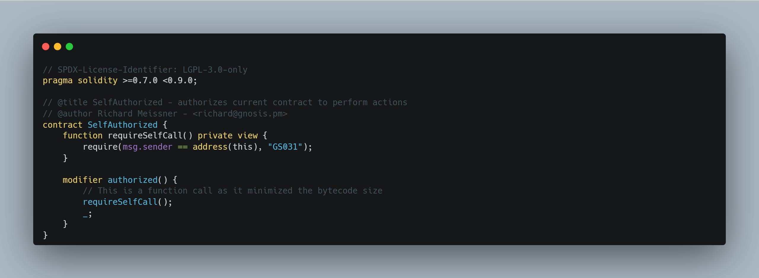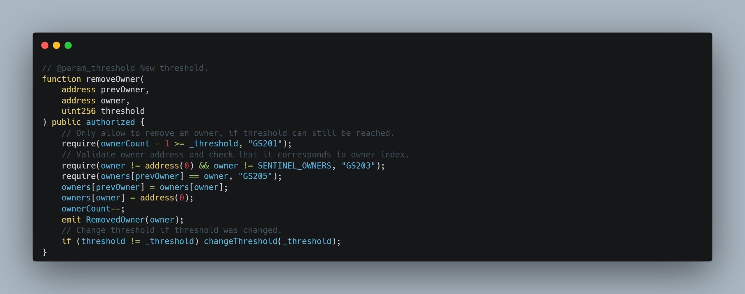 5. 调用能够成功的核心在于满足条件 msg.sender == address(this)。在 removeOwner 函数中,为了防止外部直接调用,合约设置了 authorized 验证,其内部逻辑通常要求调用者必须是合约自身 (msg.sender == address(this))。因此,只有当合约内部流程回调自身时,removeOwner 才会被成功执行。