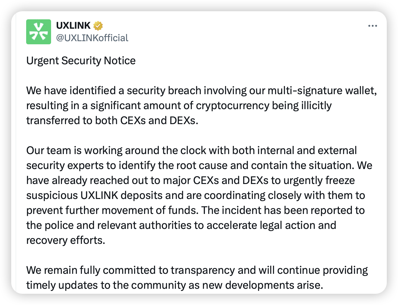 9 月 23 日,UXLINK 项目多签名钱包私钥泄漏,导致约 1130 万美元资产的加密货币被盗取,并已被分散转移至多个中心化(CEX)和去中心化(DEX)交易所。在被攻击的第一时间,我们与 UXLINK 一起调查分析这起攻击以及监控了资金流动。UXLINK 紧急联系各大交易所请求冻结可疑资金,已向警方及相关机构报案以寻求法律支持和资产追回,黑客的大部分资产已被各大交易所标记冻结,从而最大程度地降低了社区面临的进一步风险。项目方承诺将对社区保持透明,ExVul 也将持续分析跟进事件进展。