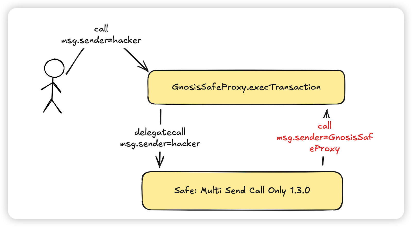 3. 在调用 execTransaction 时,攻击者在其 data 参数中指定了一个恶意操作:通过 delegatecall 方式调用 Safe: Multi Send Call Only 1.3.0 实现合约。