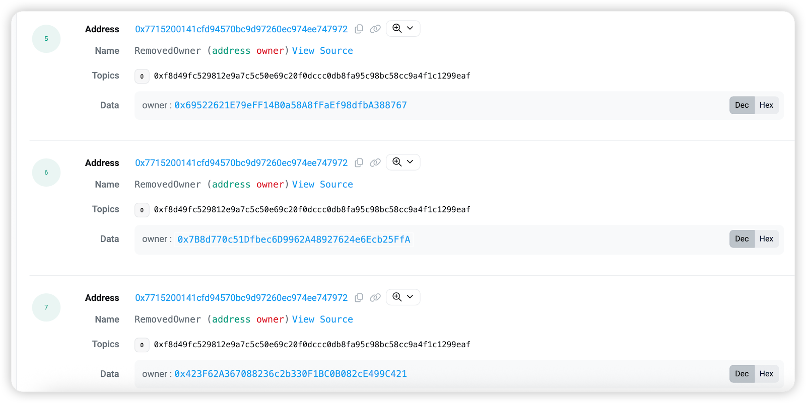 6. 黑客通过上述手法逐一删除多签中的其他 Owner,破坏多签机制并最终接管合约。