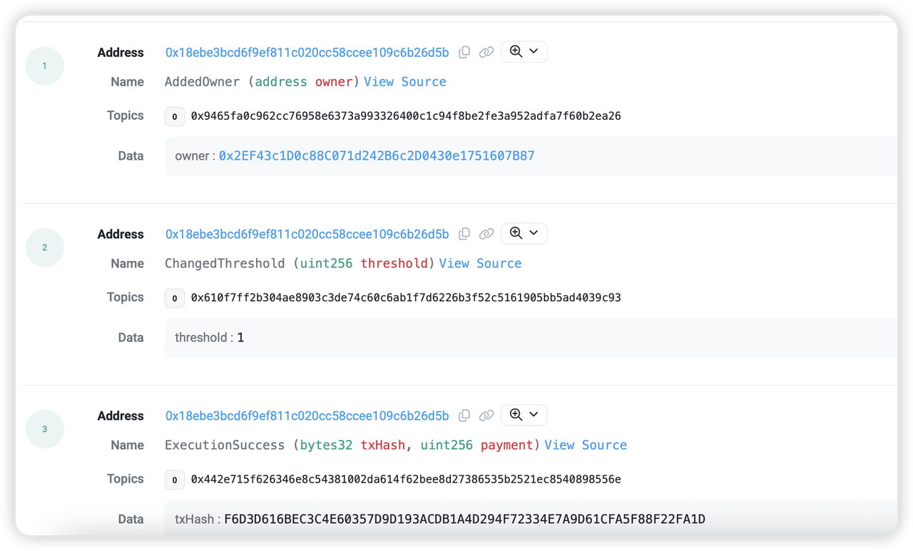 1. 此前合约因多签 Owner 存在恶意操作或私钥泄露问题,致使恶意地址被添加为多签账户,同时合约的签名阈值(threshold)被重置为 1,即只需单一账户签名即可执行合约操作。黑客设置了新的 Owner 地址为 0 x 2 EF 43 c 1 D 0 c 88 C 071 d 242 B 6 c 2 D 0430 e 1751607 B 87。