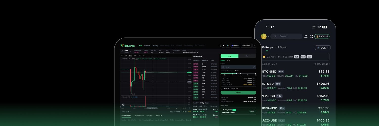 Bitverse 是基于 Pharos Network 搭建的永续合约 DEX,定位为“AI 驱动的多资产交易平台”,支持 RWA、美股及 Meme 类资产 ,主打零 Gas、零滑点、最高 50 倍杠杆的交易体验。其核心叙事围绕“一体化架构”展开,即整合了 L 1 公链、原生钱包与 Super DEX 的多层技术栈。