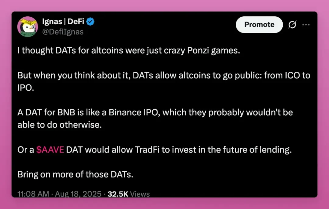 总体而言,DAT 对加密行业整体利好,尤其利好无法通过 ETF 上市的代币。它让 Aave、Fluid、Hype 等拥有真实用户与营收的项目,得以将资产敞口转移至股票市场。