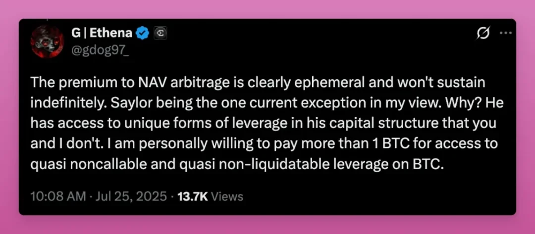 除了 Michael Saylor(MicroStrategy 创始人),多数 DAT 难以维持长期净值溢价。DAT 的真正价值不在于溢价游戏,而在于准入渠道, 即便仅能维持 1:1 净值且资金流入稳定,也比完全无法接入股票市场要好。