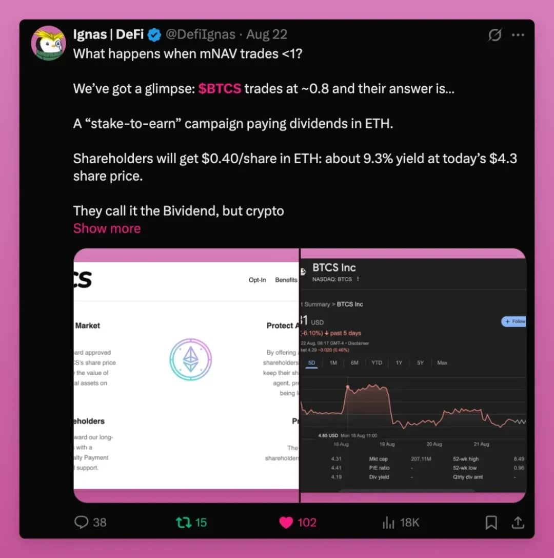 近期就出现了市场净值(mNAV)>1 的案例。简单来说,DAT 向股东分发以太坊,而股东很可能会抛售这些以太坊。即便进行了类空投操作,BTCS(某 DAT 代币)的交易价格仍仅为其市场净值的 0.74 倍,情况不容乐观。