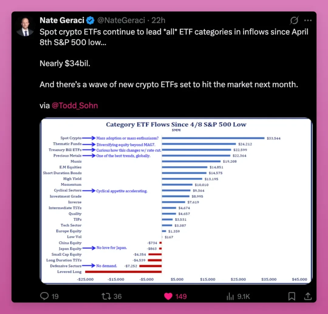 加密 ETF 的买家包括养老金、投资顾问与银行。如今,加密货币已与黄金、纳斯达克指数一同出现在资产配置讨论中。
