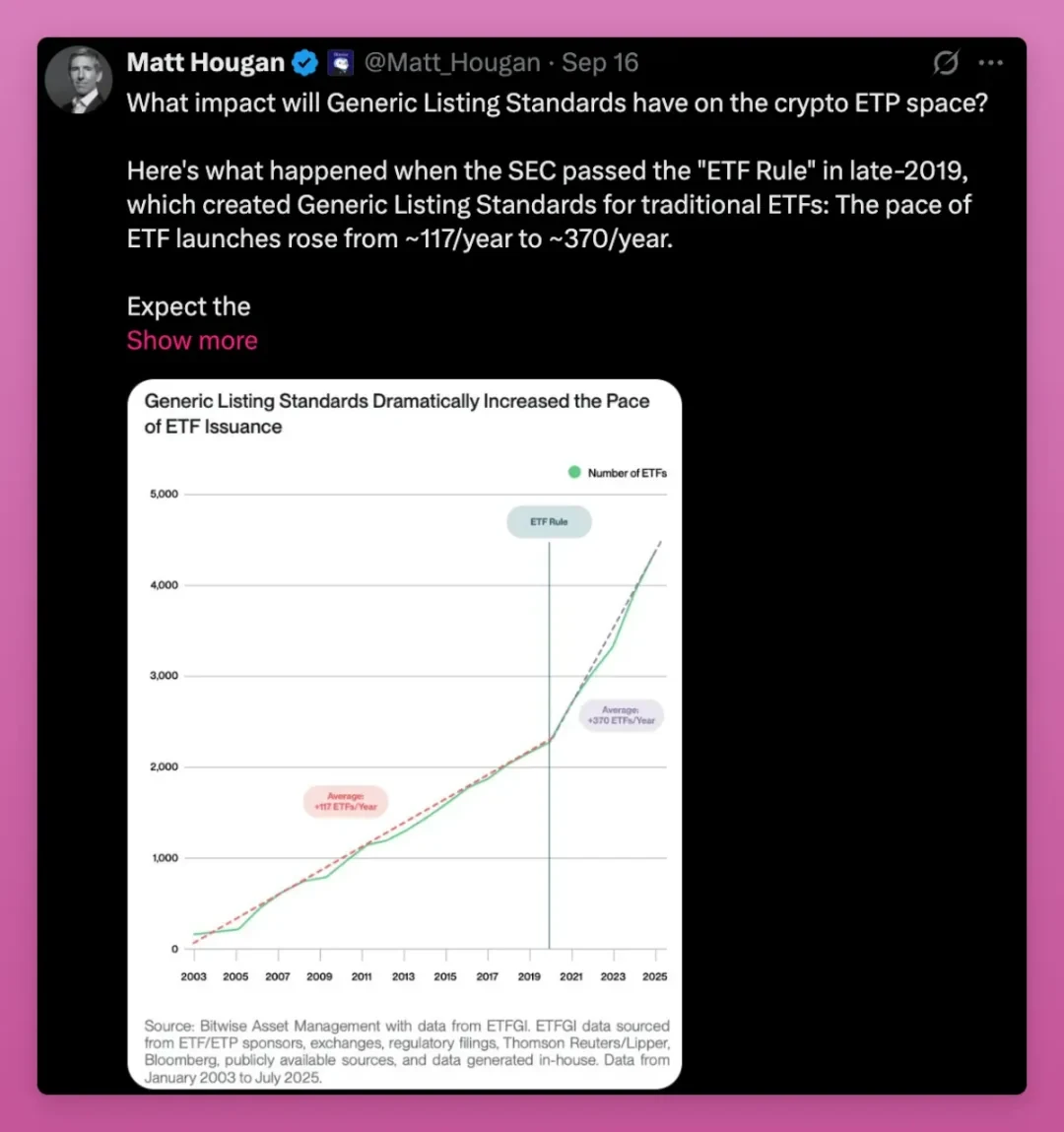 2019 年,美股市场类似的通用规则 让 ETF 发行量增至三倍。加密货币领域有望重现这一趋势:未来将涌现大量针对 SOL、HYPE、XRP、DOGE 等资产的 ETF,为散户提供充足的退出流动性。