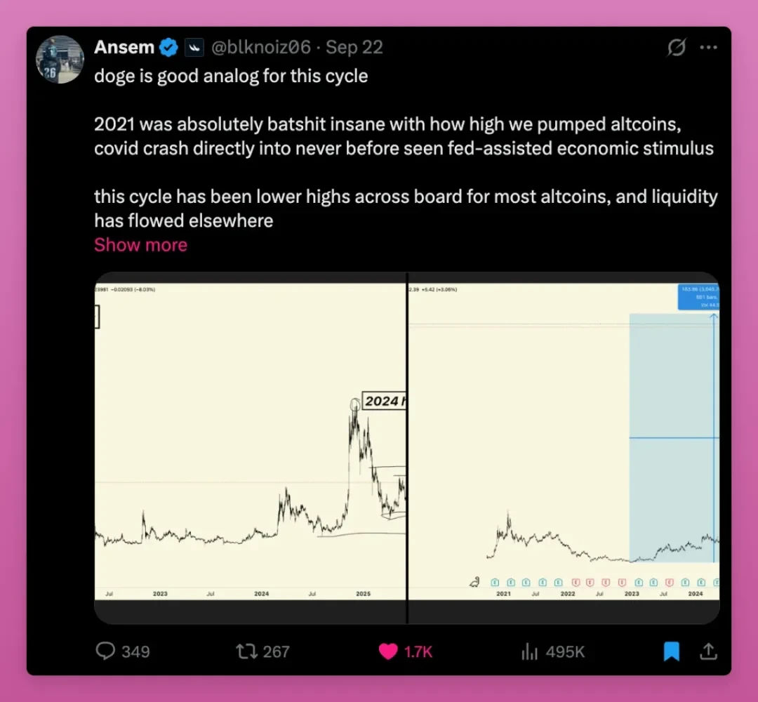 正如 Ethena 创始人 G 所言:「我担心的一点是,我们已耗尽『加密原生资本』,无法将山寨币推升至前一轮周期的峰值。对比 2021 年第四季度与 2024 年第四季度的山寨币总市值峰值,两者相差无几(均略低于 1.2 万亿美元);若剔除通胀因素,两轮周期的峰值几乎完全一致。这或许就是全球散户能为『概念性资产』投入的最大资金规模。」