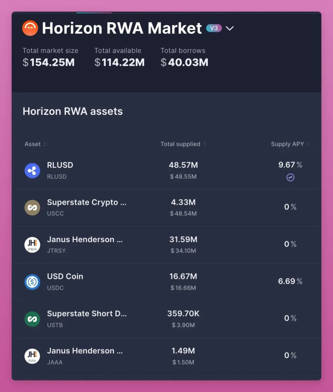 Aave 的 Horizon 协议允许用户存入标普 500 指数代币化资产并以此抵押借贷。尽管当前锁仓量(TVL)仅 1.14 亿美元,表明 RWA 仍处于早期阶段。