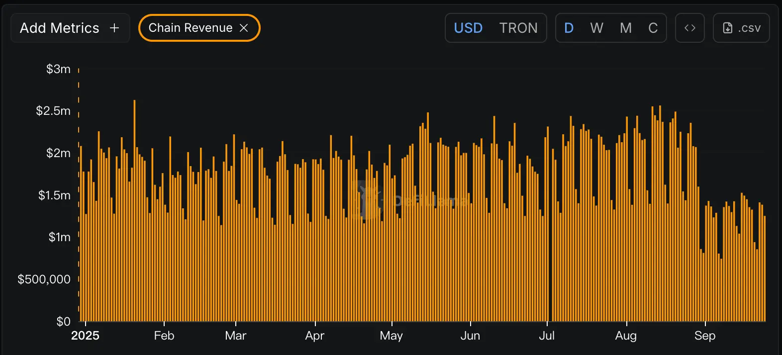 根据 DeFi Llama 链上数据来看,Tron 的九月平均收入与上月比确实出现断崖式下跌,减少幅度将近 5 0%。