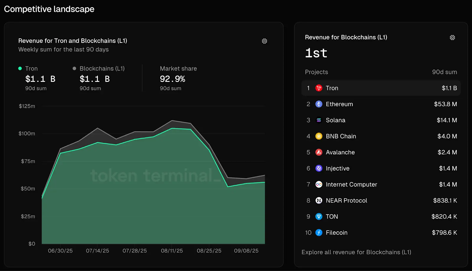 根据 Token Terminal 数据,过去七天 Tron 仍占 L1 公链总收入的 92.9%。而过去 90 天, Tron 手续费总收入仍远高于同期的以太坊、Solana、BNB Chain 与 Avalanche。