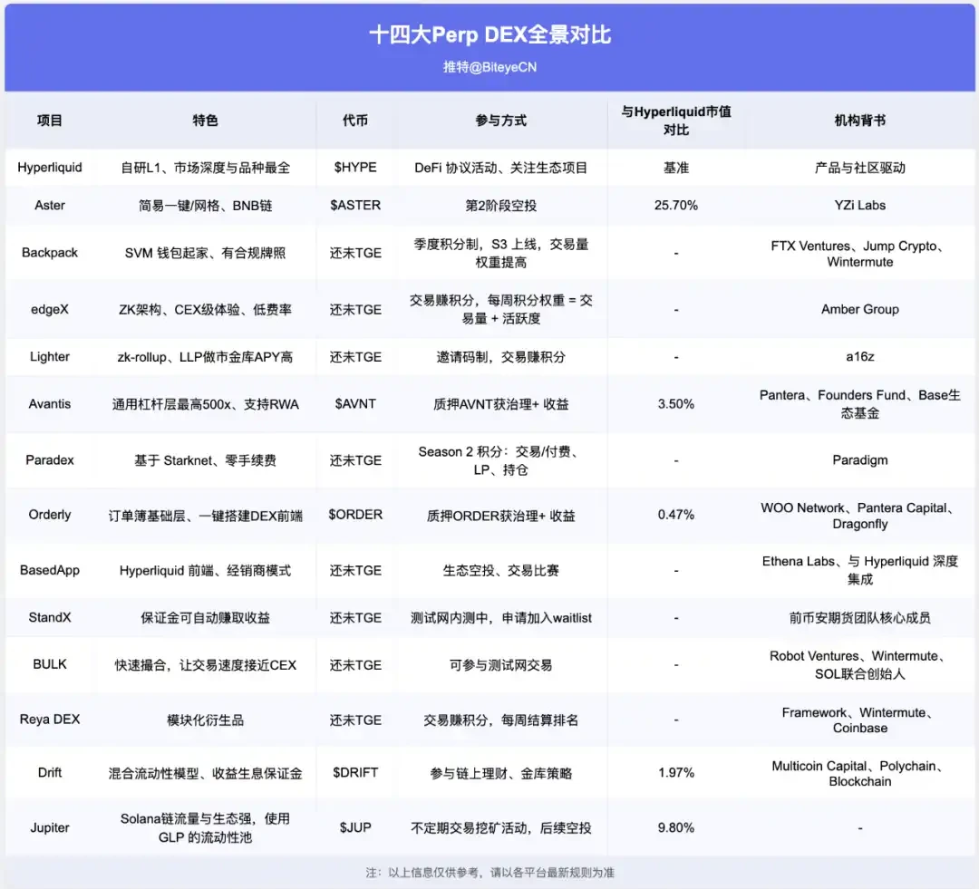 Binance 系(Aster、StandX)、Amber 系(edgeX)、Paradigm 系(Paradex)、Solana 系(BULK/Backpack/Jupiter/Drift)、Base 系(Avantis)…… 各有版图。