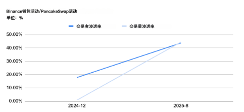 到 2025 年 8 月,PancakeSwap 日均交易量增至 30 亿美元,而 Binance Wallet 已达到 14 亿美元。PancakeSwap 日活交易者均值为 5.39 万,Binance Wallet 为 2.14 万,渗透率双双超过 40%。