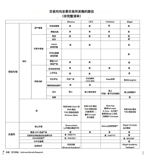 这与传统金融路径类似:支付宝先以支付吸引用户,再叠加理财产品;平安先做保险,再延伸至综合金融。加密交易所同样在结合支付、存款与收益,部分定位为全景交易所,部分则发展为超级应用(如 Coinbase Base App),融合支付、社交、MiniApp、代币化内容(Zora、Farcaster)。