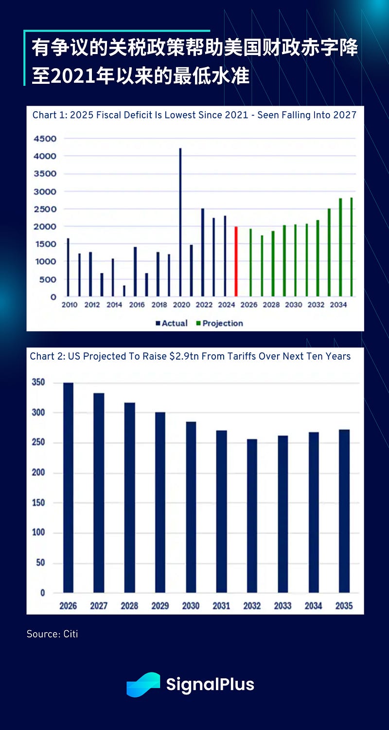 随著美国财政年度在 9 月底结束,根据花旗研究,实际财政赤字实际上这次大致与国会预算办公室的估计相符(19900 亿美元 vs 19780 亿美元)。这实际上意味著赤字比 2024 年减少了 3100 亿美元,并且是自 2021 年以来最低的绝对赤字水准。虽然其长期影响尚无定论,但美国的关税政策显著改善了财政状况,预计在过去十年中带来了 3 万亿美元的收入,有助于降低未来两年的预期赤字。