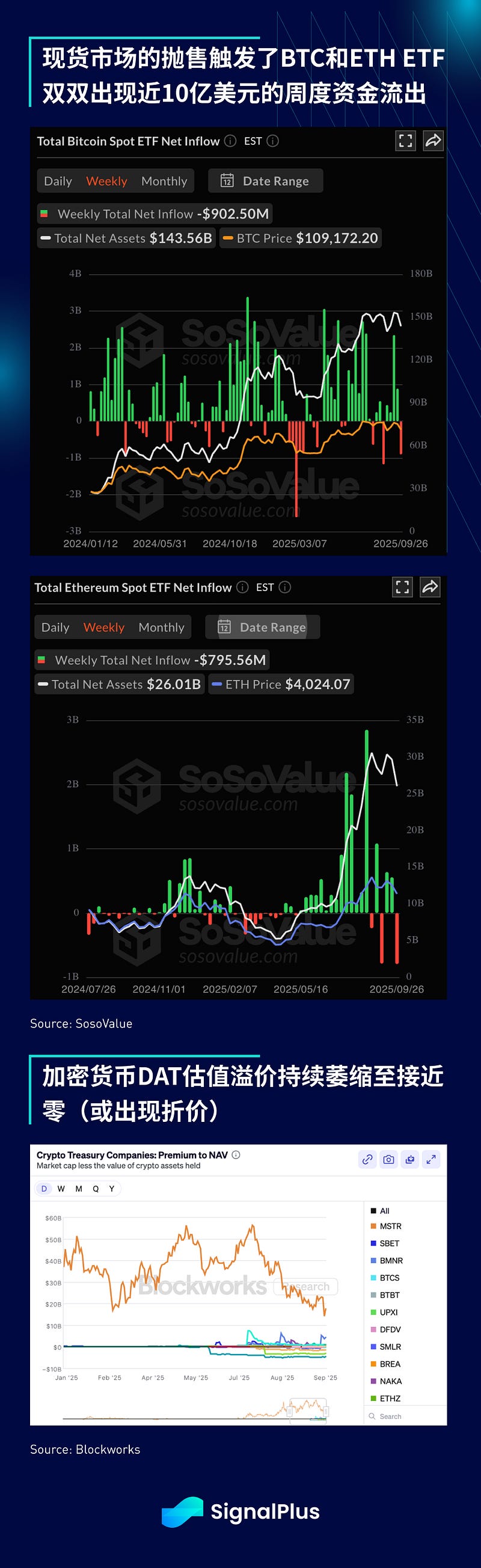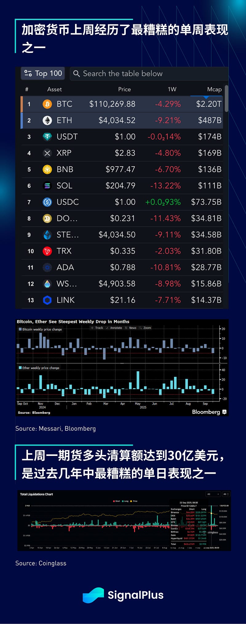 加密货币上周的情况则远没有那么乐观,该行业市值因一系列大型山寨币的快速去杠杆化而损失了 3000 亿美元(ETH -10%,Solana -13%)。上周一单日清算金额超过 30 亿美元,导致 BTC 和 ETH ETF 分别出现近 10 亿美元的周度资金流出。