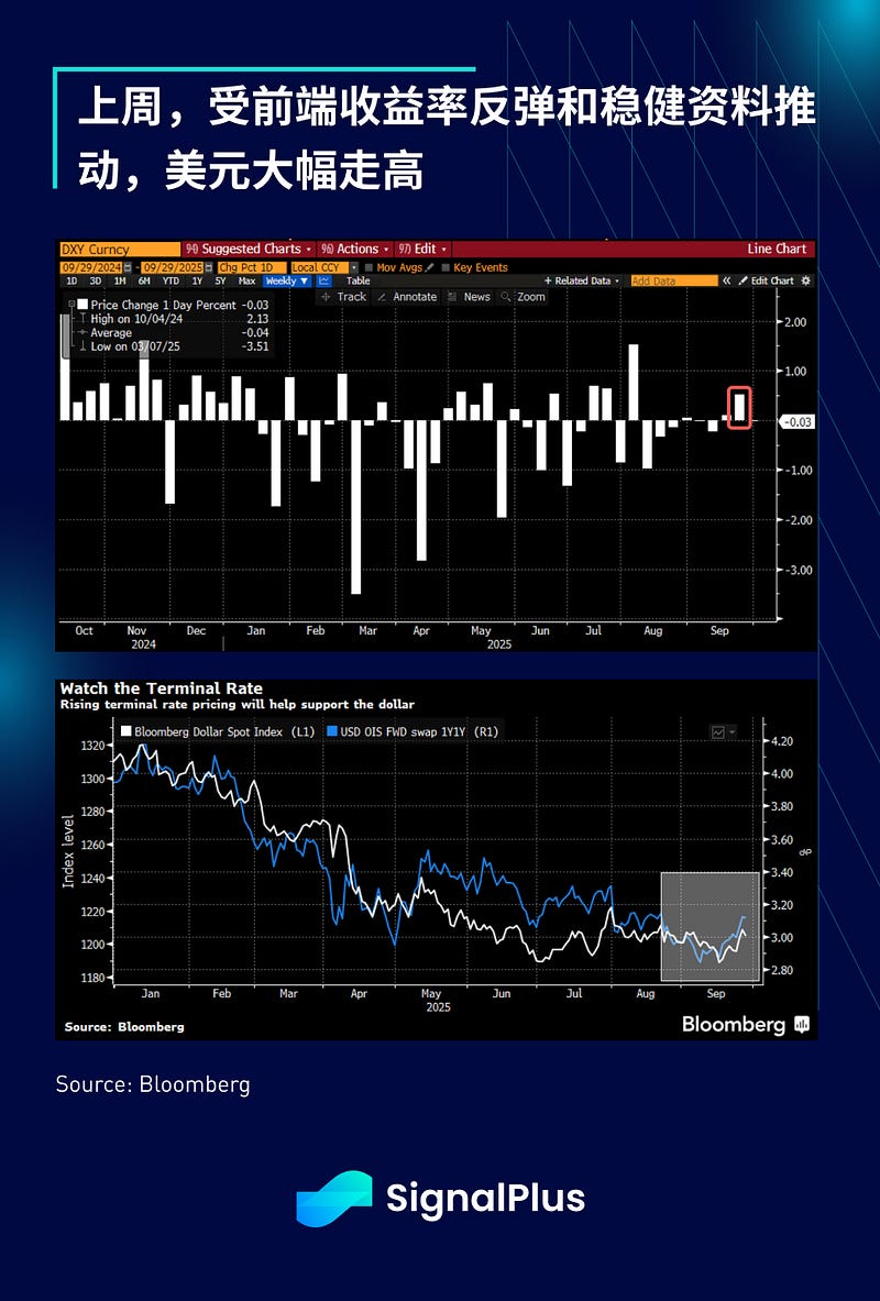 作为回应,美元经历了自仲夏以来最强劲的周度表现之一,这得益于有韧性的美国资料和过去一周前端收益率的急剧重新定价。美元持续的净空头持仓可能会将这种挤压行情进一步推入第四季度,特别是如果美联储的鸽派言论哪怕只是温和减弱,或者万一股市出现下跌,可能引发避险资金流入。