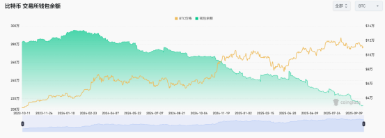 或许也正是基于此,加密市场价格虽有下滑,但总体表现仍然坚挺。尤其是比特币,价格上仍落于10.5万-11万美元区间,支撑有效,同时比特币在交易所的存量稳步下跌,目前仅有212.6万枚,创下了近两年来的新低,放映出持有者的长期持有倾向。总体来看,虽然上涨动力存在不足,但利空暂时也未出现。