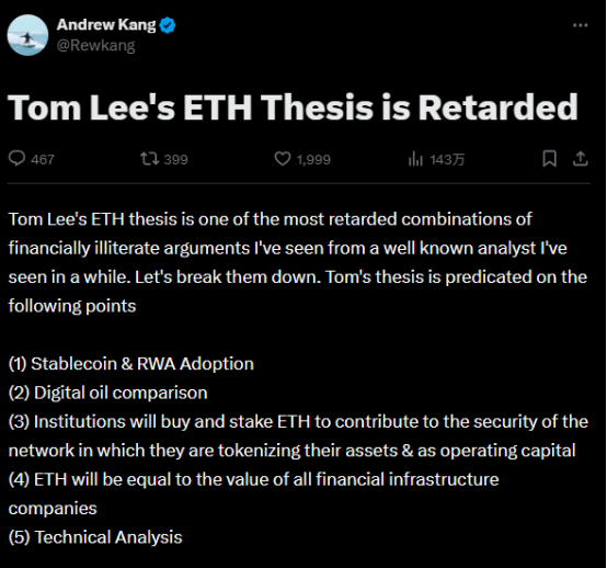 相比较比特币而言,以太坊的问题反而更大。针对以太坊的价格走势,市场上分歧不断,就在前不久,加密风投机构Mechanism Capital 的创始人Andrew Kang与ETH最大财库持有者Bitmine的CEO Tom Lee还爆发了一场ETH价格论战。针对以太坊代言人Tom Lee提出的以太坊未来五大愿景,Andrew Kang一一给出了反击,表示由于稳定币链的存在以及RWA的低流动性使得稳定币与RWA难以为以太坊带来持续收入,并且提出机构买入质押纯属空谈,理由就是现如今没有一家大型银行或资管机构宣布将 ETH 纳入资产负债表,其还对以太坊的定位提出了质疑,认为ETH仅仅是一种周期性资产,长期估值并不具有持续上涨的逻辑支撑,更是对以太坊全球金融基础设施的设想予以了驳斥。