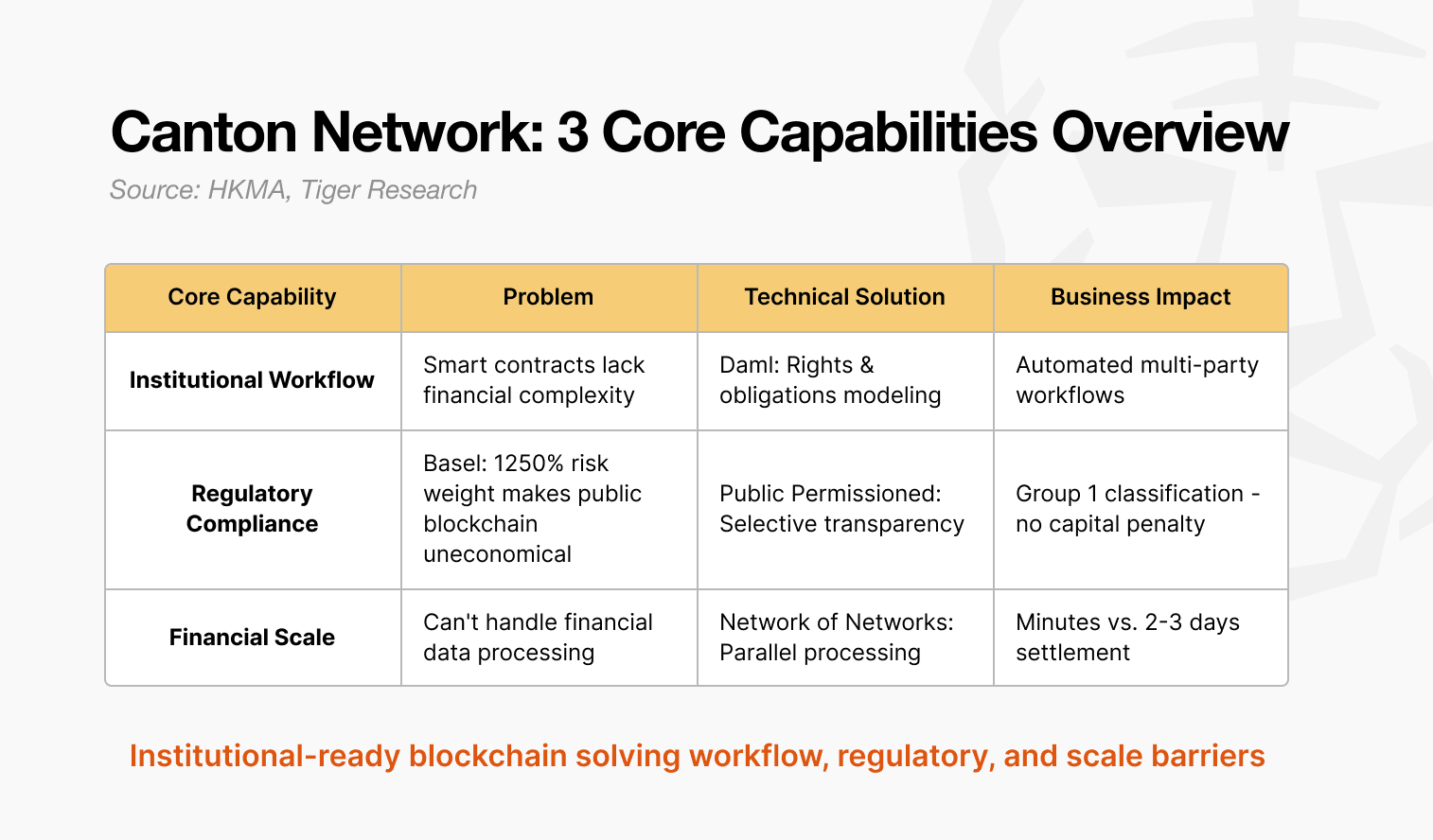 Canton Network 通过 Canton 协议实现差异化,该协议使机构在保留区块链实时结算和资本效率优势的同时,满足监管要求并管理风险。由此将其定位为支持从试点走向大规模机构采用的基础设施。