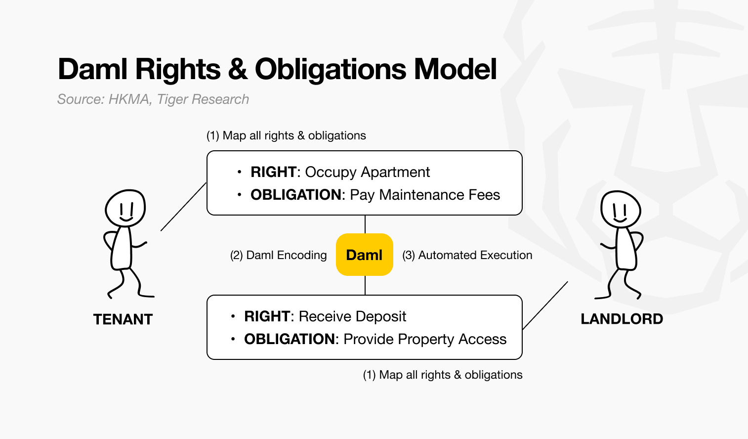 例如,在租赁合同中,租客拥有占用公寓的权利,但负有支付维护费用的义务;房东有收取押金的权利,但负有提供房屋使用权的义务。Daml 将此类关系精确编码为可执行形式。
