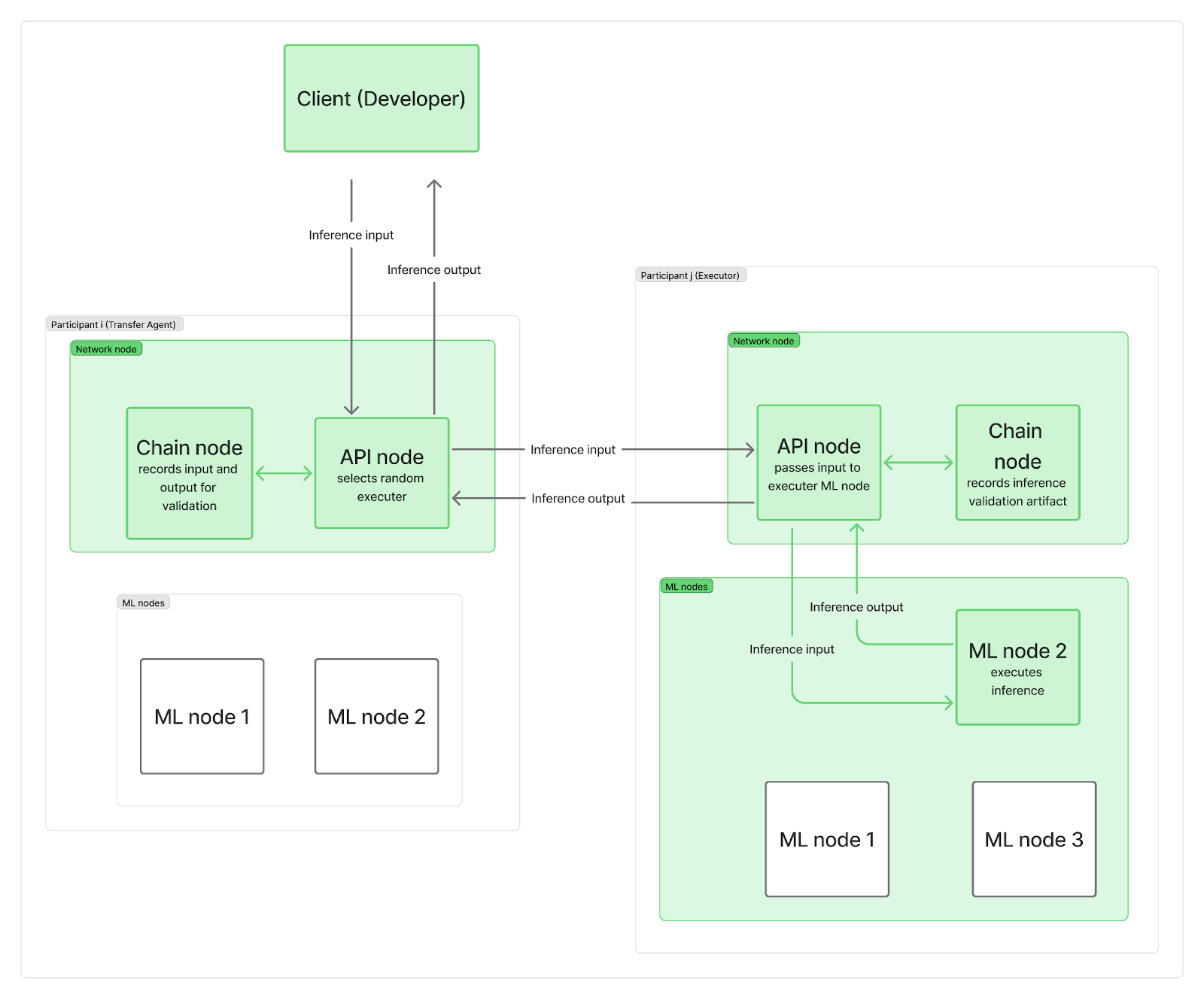 我们希望系统是去中心化的,没有任何单一中心点来指挥推理请求到网络节点。实际上,每个参与者至少部署两个节点:一个网络节点和一个或多个推理(ML)节点。网络节点负责通信(包括一个连接到区块链的链节点和一个管理用户请求的 API 节点),而你的 ML 节点则执行 LLM 推理。