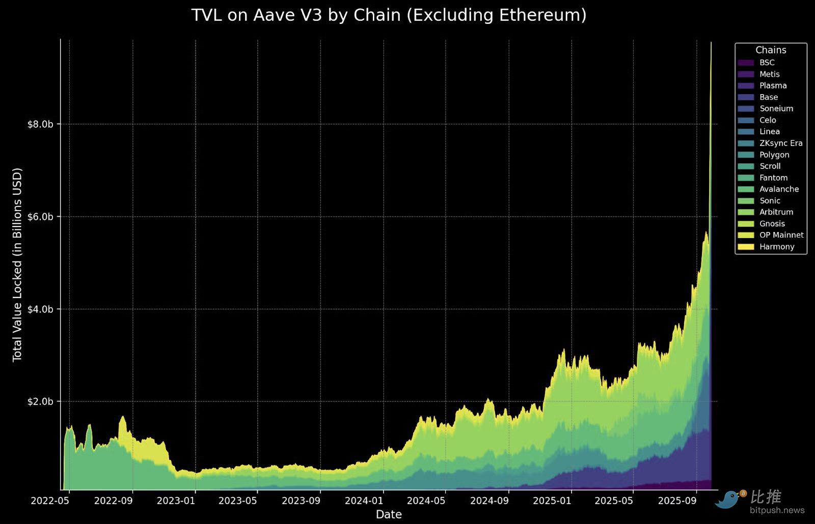 换言之,Plasma 单链的 Aave 资金量,相当于Arbitrum、Base、Linea 与 Avalanche 的总和。