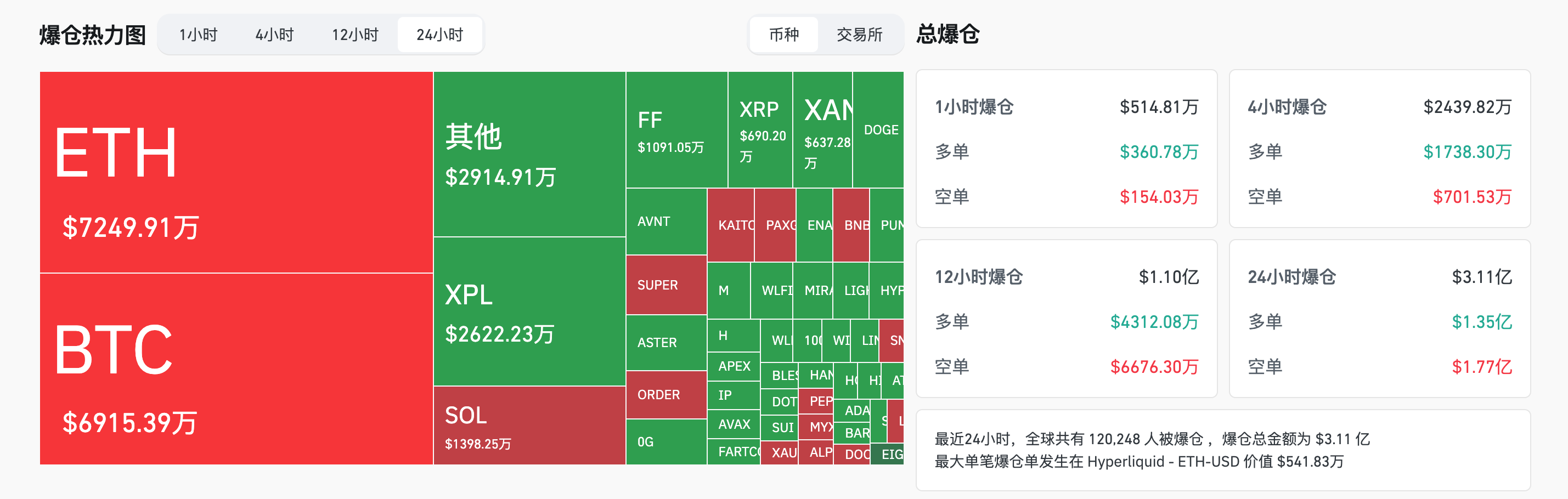 衍生品市场方面,据 Coinglass 统计,过去 24 小时共有超过 12 万人遭遇爆仓,全网爆仓金额达 3.11 亿美元,其中多单爆仓 1.35 亿美元,空单爆仓 1.77 亿美元。ETH 爆仓金额达 7249 万美元,成为爆仓“重灾区”;BTC 与 XPL 紧随其后,爆仓金额分别为 6915 万美元与 2622 万美元。