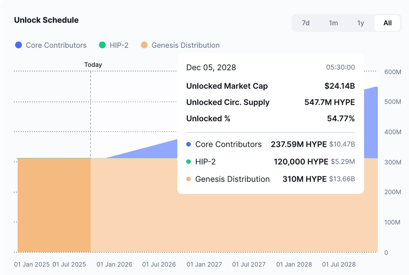 苹果无需担心「2 亿股新股票一夜流入市场」,但 Hyperliquid 面临这一问题:从 2025 年 11 月开始,价值近 120 亿美元的 HYPE 代币将向内部人员解锁,其规模远超日常回购量。