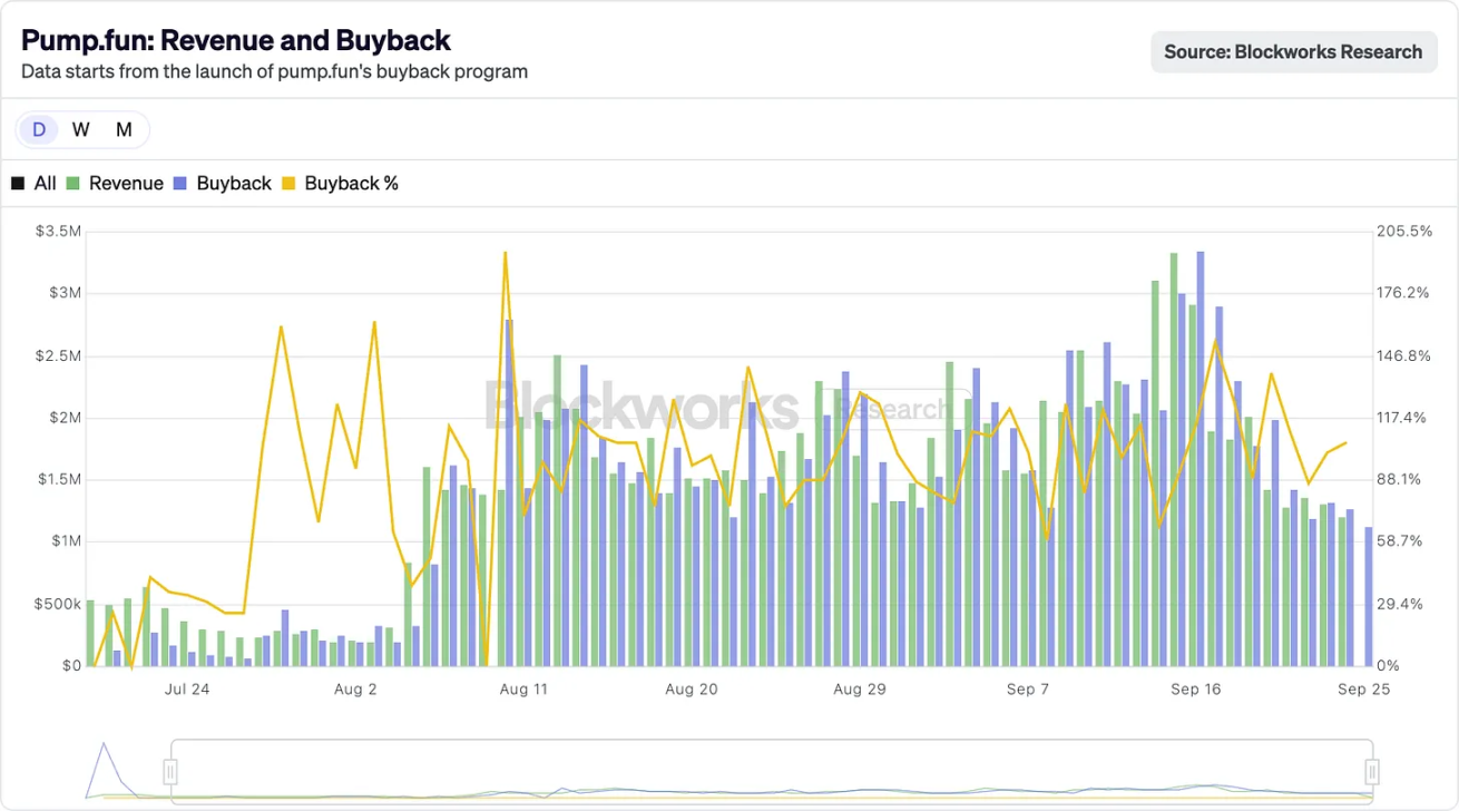Hyperliquid 在 2025 年 8 月创下 1.06 亿美元手续费收入的纪录,其中超 90% 被用于在公开市场回购 HYPE 代币。与此同时,Pump.fun 的日收入曾短暂超过 Hyperliquid——2025 年 9 月某日,该平台单日收入达 338 万美元。这些收入最终流向何处?答案是 100% 用于回购 PUMP 代币。事实上,这种回购模式已持续了两个多月。