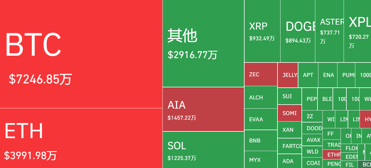 衍生品方面, coinglass.com 数据显示,最近 24 小时,全球共有 11.27 万人被爆仓 ,爆仓总金额达 2.56 亿美元,多单爆仓 1.17 亿美元,空单爆仓 1.39 亿美元, 多空皆伤 ,说明此次新高让人猝不及防。其中仅 BTC 爆仓金额已高达 7247 万美元,占比达 28%。最大单笔爆仓单发生在 Bybit - BTCUSDT ,价值 311.53 万美元。