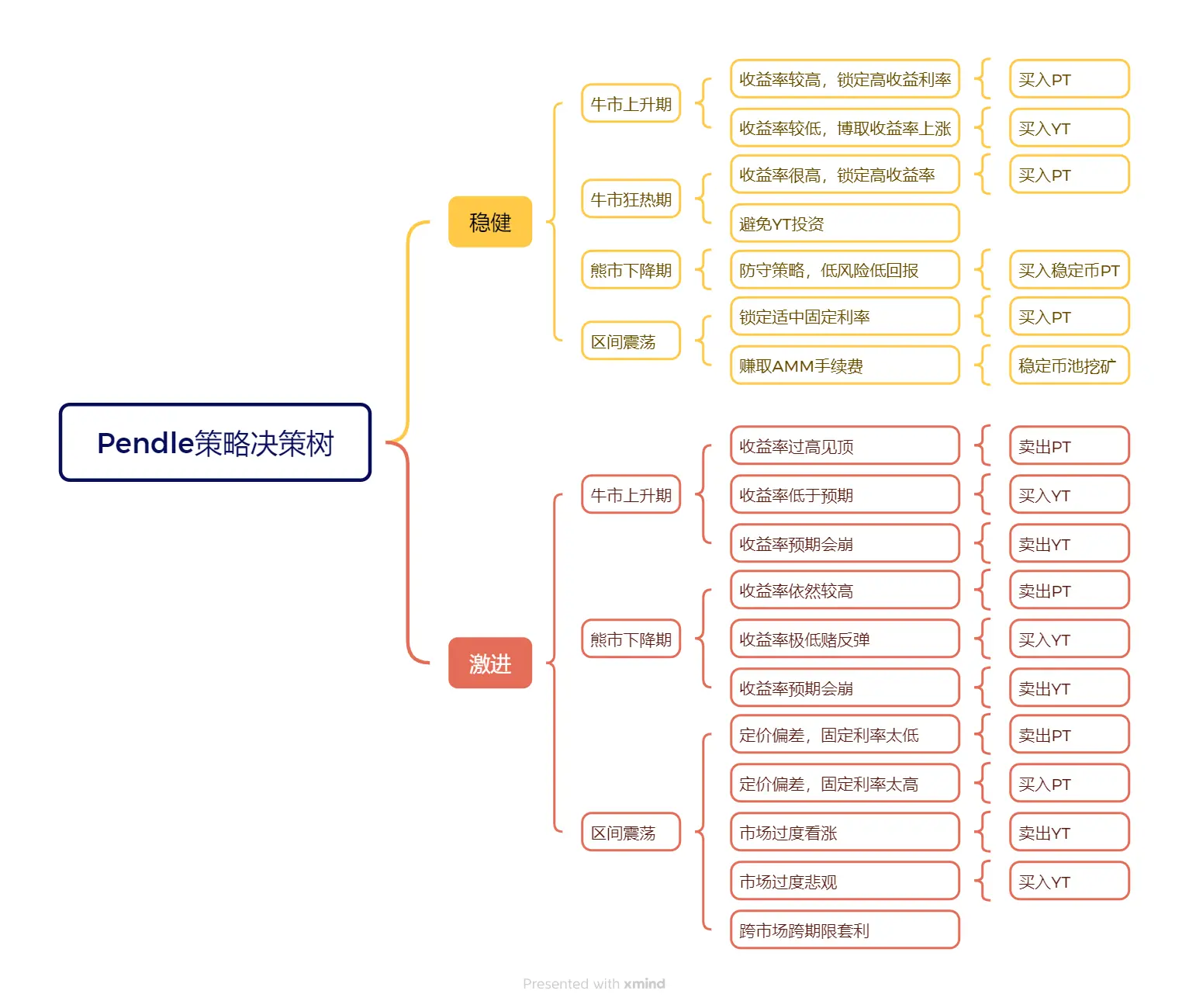 当然,以上策略总体以稳健收益为主,核心逻辑是在不同市场周期下通过 𧹒入 PT、𧹒入 YT 或参与稳定币池挖矿 来实现风险与收益的平衡。对于风险偏好较高的激进型投资者,也可以选择更具进攻性的 卖出 PT 或 YT 策略,用于押注利率走势或博弈市场错配。此类操作对专业判断和执行力要求更高,风险仓位也更大,因此本文不做过多延展,仅供参考,具体可见下方决策树。