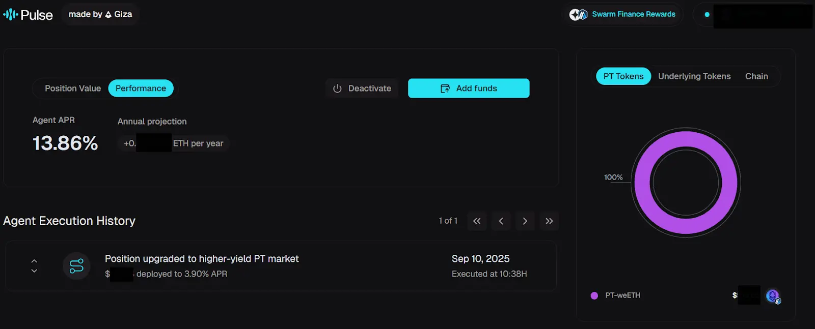 - 退出与资产提取:使用者可随时关闭 Agent,Pulse 会自动清算 PT 代币并兑换回 ETH,仅对利润部分收取 10% success fee,本金全额返还。退出前系统将透明展示收益与费用明细,提现通常数分钟内完成。使用者退出后可随时重新啟用,历史收益记录将被完整保留。