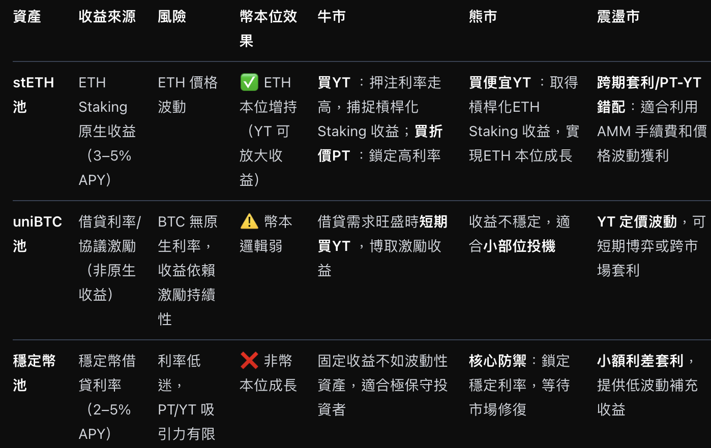 - 熊市:stETH 低价 YT 提供增持 ETH 的核心机会;稳定币池承担主要防禦功能;uniBTC 仅适合小规模短期套利。